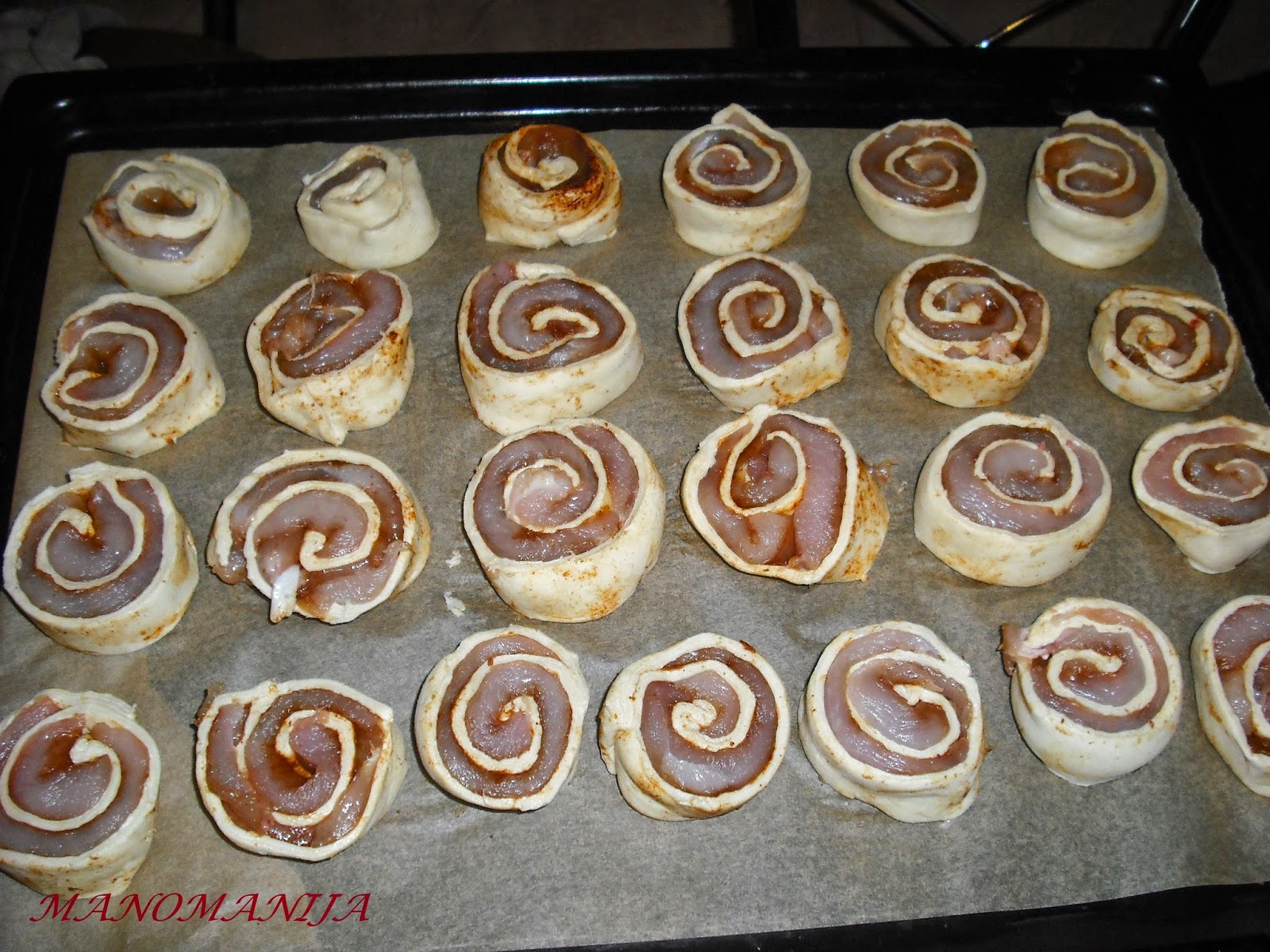 Plokšteles sudėlioti ant sluoksniuotos tešlos, susukti ir supjaustyti maždaug 2-3cm storio gabaliukais.
